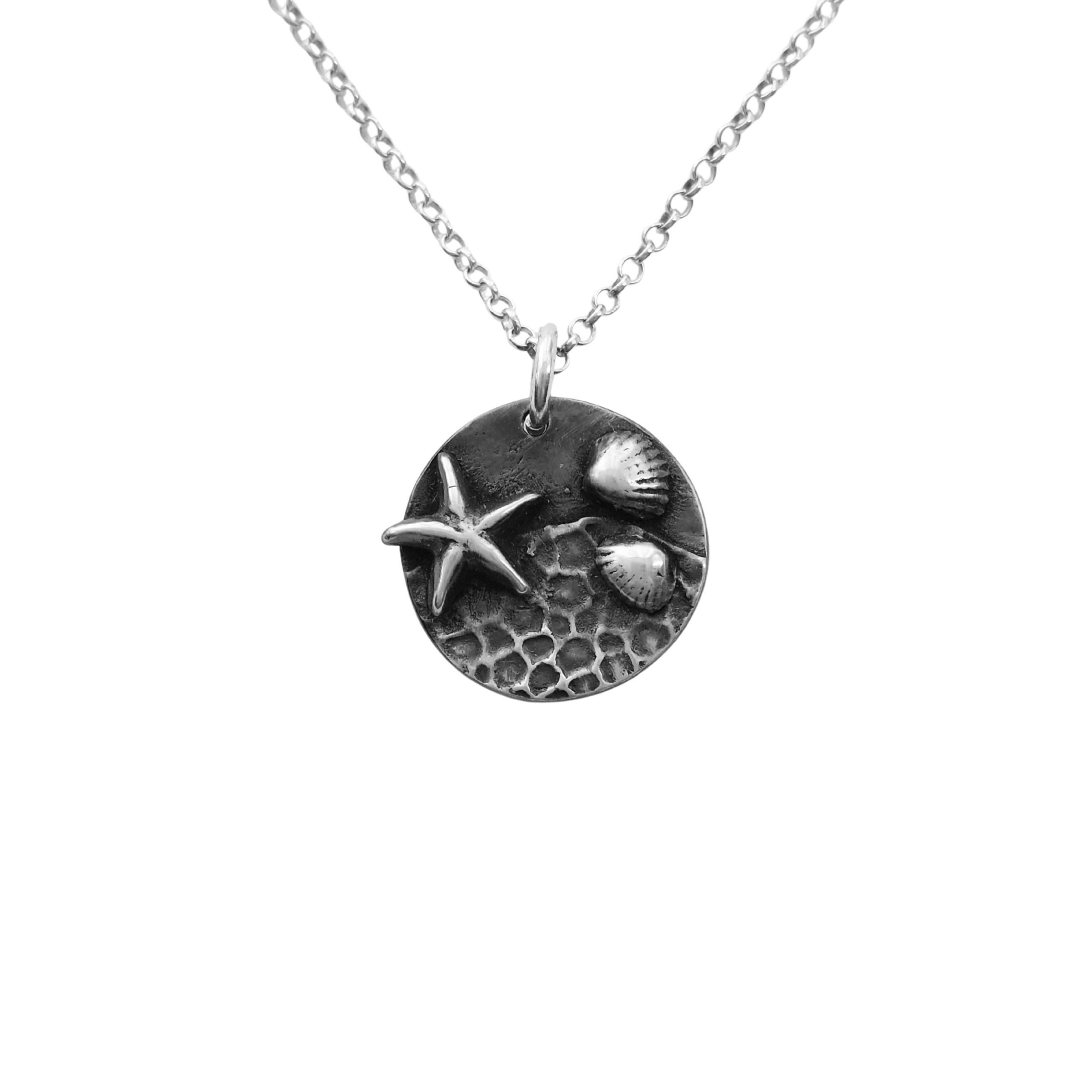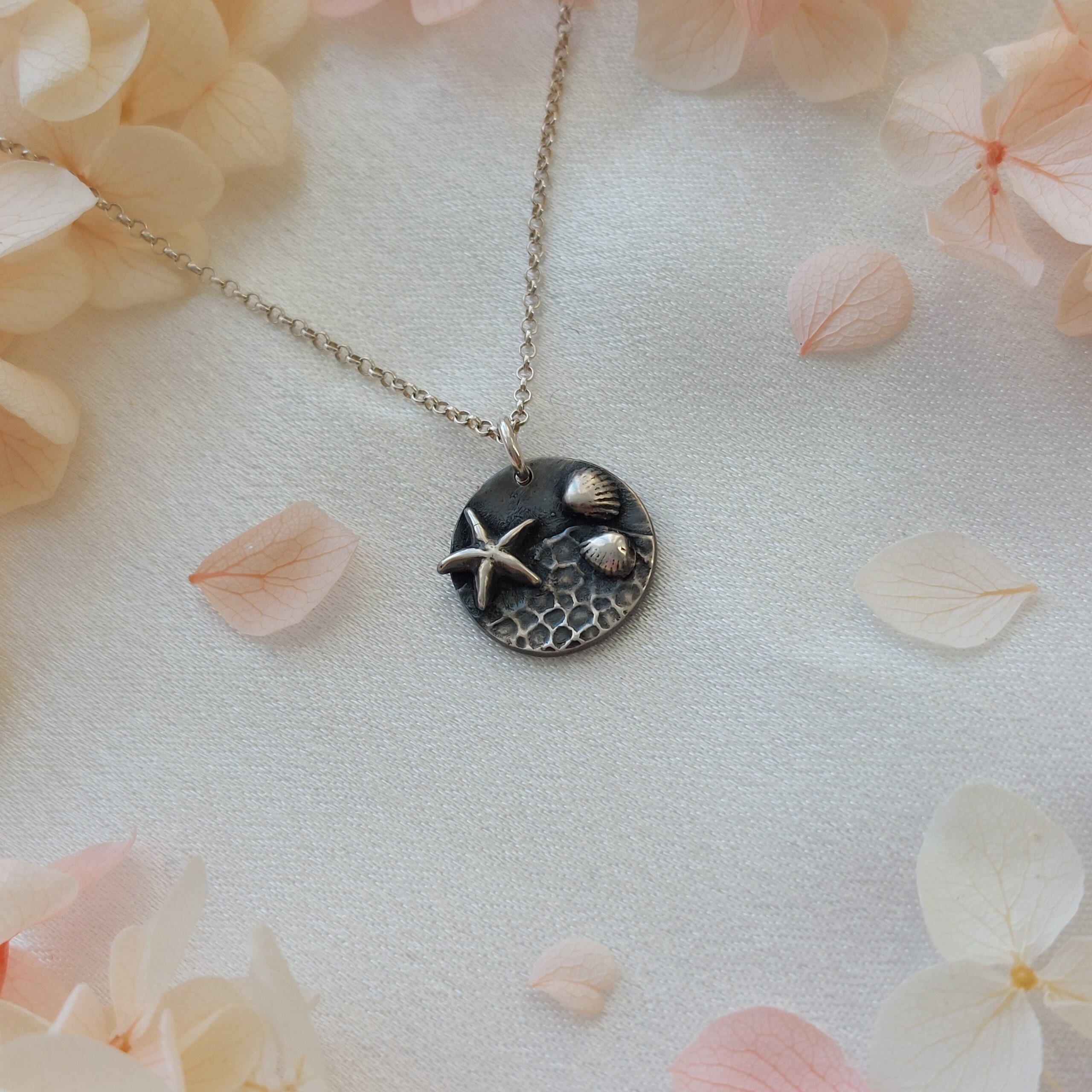 Merevaikus on käsitööna valminud hõbedane ripats, mis kannab endas mereranna rahu ja võlu. Reljeefne pind meenutab rannaliiva ja kivide mustreid, mida kaunistavad peened teokarbid ja meritäht – justkui väike mälestus rannast, kus aeg peatub.