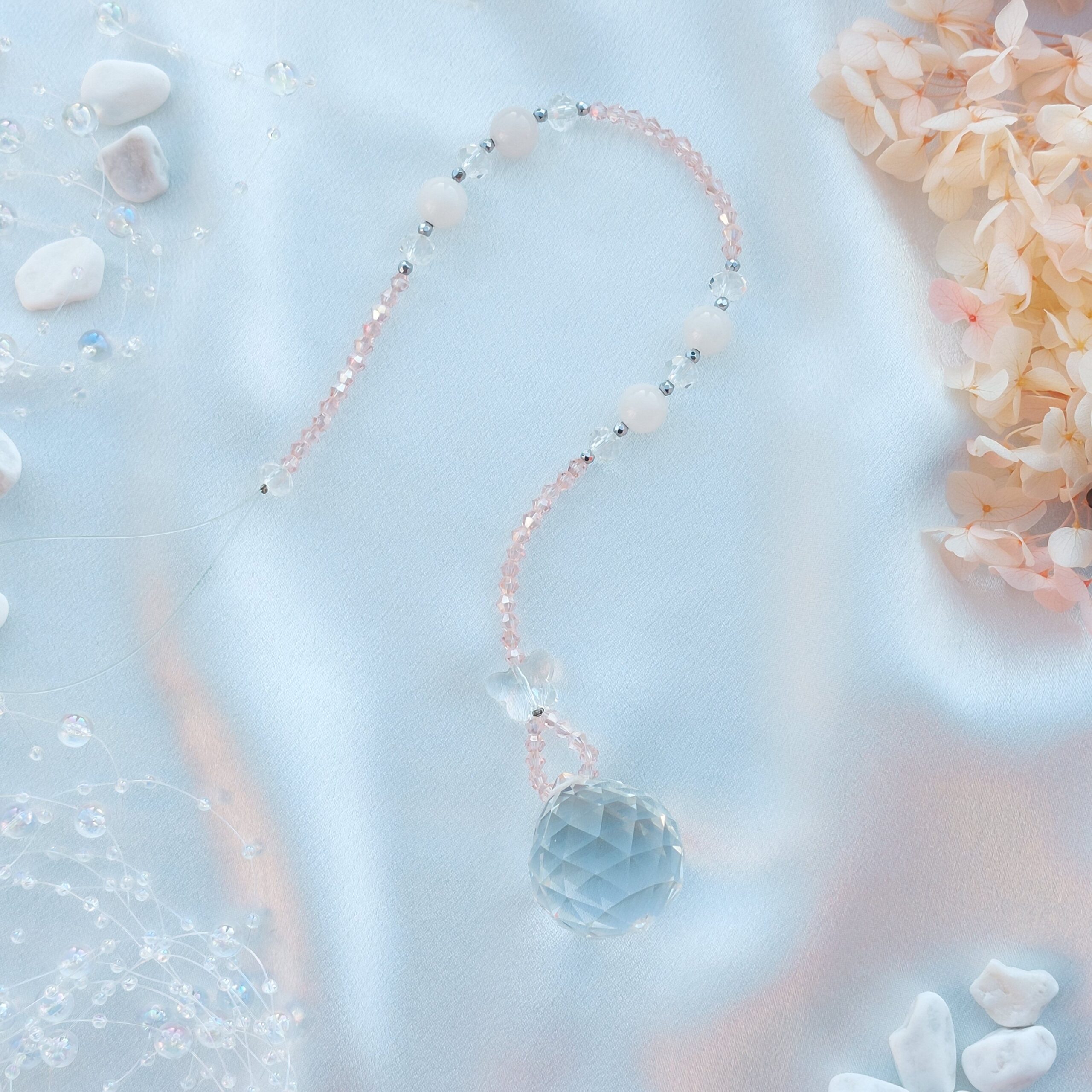 Keskmine Feng Shui päikesepüüdja roosa kvartsi, klaaspärlite ja liblikaga.