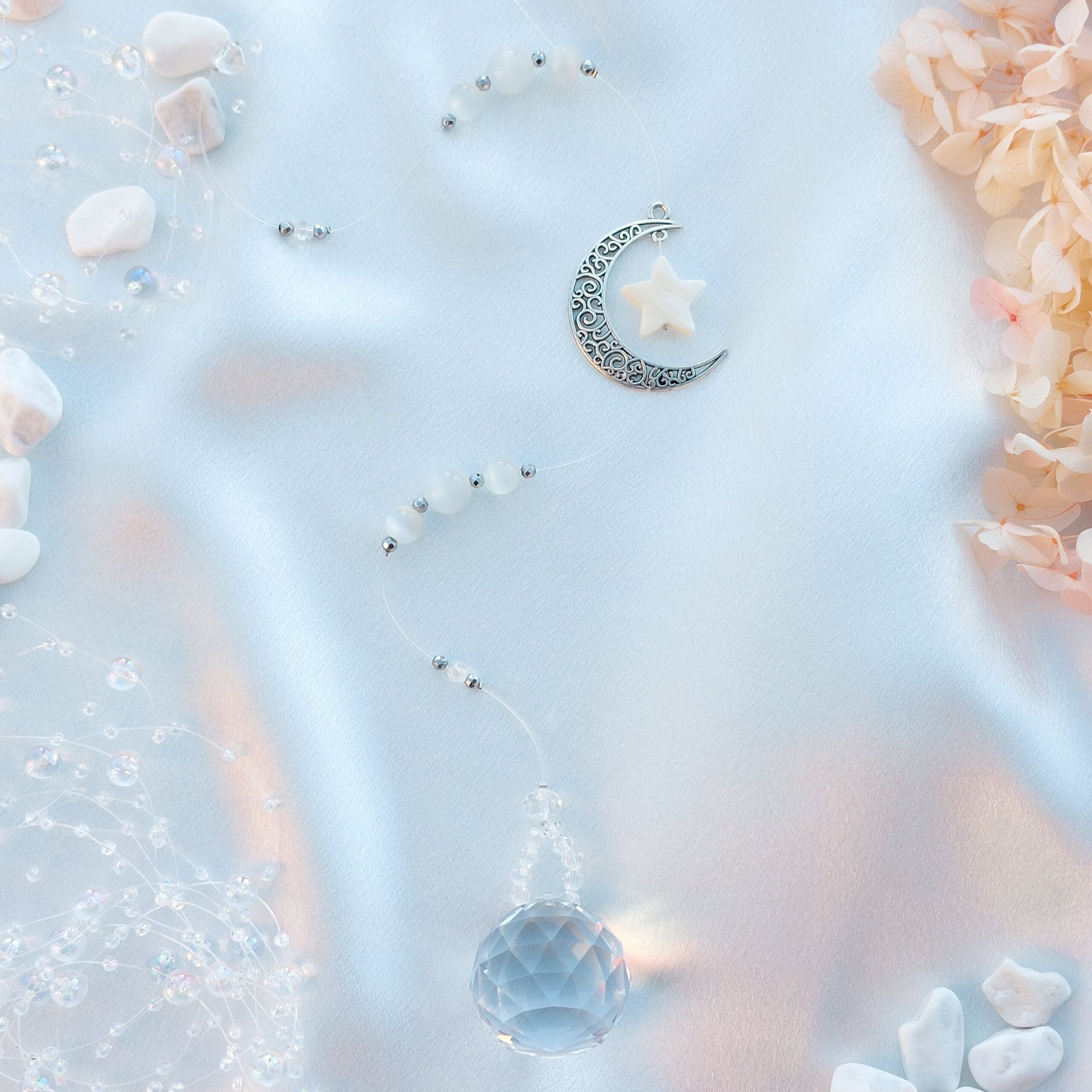 Feng Shui päikesepüüdja kuu ja valgest pärlist tähega. Kaunistatud kassisilmast pärlitega.